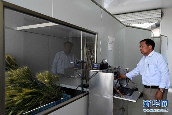 茹振钢在使用数字化实验风洞测试小麦的抗倒性(5月22日摄)。