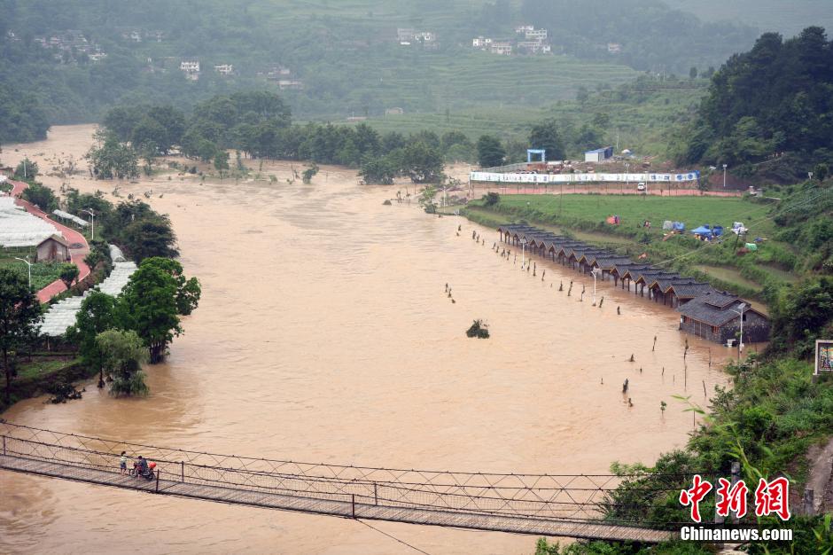 2015年6月2日傍晚至6月3日凌晨,贵州省贵阳市开阳县遭受强降雨袭击,全县普降暴雨,局部大暴雨。截止6月3日早上6时,该县南龙乡、南江乡、龙岗镇、禾丰乡4个乡(镇)降大暴雨,降雨降量普遍超过100毫米,最大雨量站南龙乡达190.3毫米,双流镇、毛云乡、永温镇、龙水乡、高寨乡、城关镇等6乡(镇)降暴雨,其余乡(镇)降雷雨。由于此次降雨时间短、强度大、范围集中,造成该县不少地方遭受洪涝灾害。据不完全统计,截止6月3日中午,此次强降雨导致开阳县48549人受灾,1489.6公顷农作物受灾,损坏房屋331户770间,经济损失11093.89万元,此次暴雨还造成该县通信、交通、水利等基础设施遭受不同程度损坏,损毁公路1534米,桥梁一座,沟渠1533米。目前抢险救灾及应对工作正在紧张有序地进行中。图为2015年6月4日,禾丰乡马坝河水暴涨。 陈金 摄
