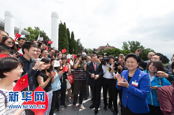 6月9日,国务院副总理刘延东(前右)在瑞士洛桑会见中国留学生代表。当日,国务院副总理刘延东在瑞士洛桑出席北京2022申冬奥代表团与国际奥委会委员陈述交流会后,在奥林匹克博物馆会见中国留学生代表,与他们亲切交谈并合影留念。新华社记者 徐金泉 摄