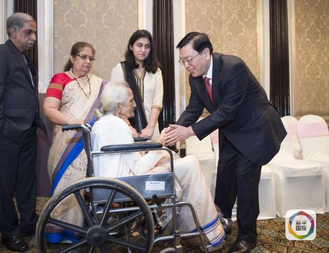 已是94岁高龄的柯棣华三妹马诺拉玛,坐在轮椅上由家人推着,亲自参加了接见和图片展。当她进入会见厅时,张德江亲切地俯身与她握手寒暄。