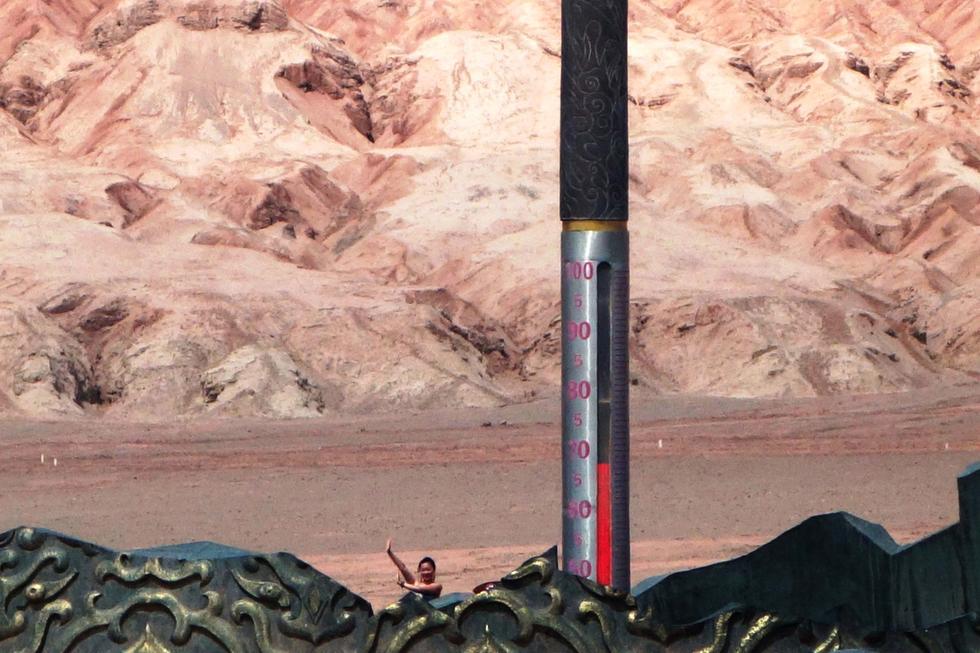 6月14日,新疆吐鲁番,当天15:50左右,一名游客在火焰山风景区巨型电子温度计前摆酷拍照,温度计上显示的适时地表温度高达68摄氏度。