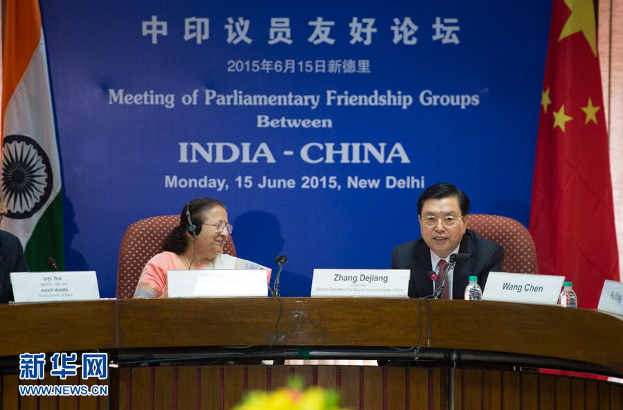 6月15日,中国全国人大常委会委员长张德江在新德里和印度人民院议长马哈詹共同出席中印议员友好论坛闭幕式并分别致辞。 新华社记者谢环驰摄