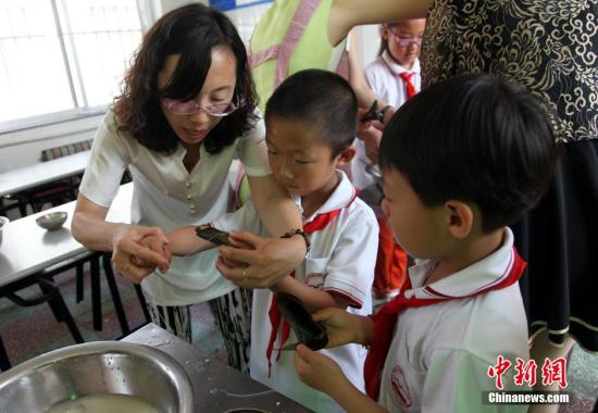 资料图:6月16日,威海市文登区实验小学举行“大手牵小手情暖端午节”活动,多名校园妈妈与留守孩子们一起包粽子,迎接即将到来的端午节。。中新社发 杨甜艺 摄