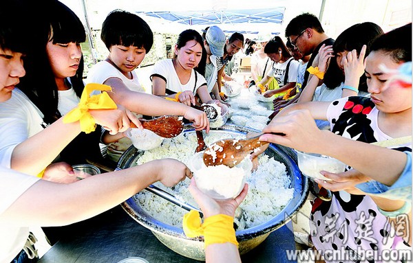 图为:6日,监利实验中学的高中生在武警官兵驻地,为一线救援官兵准备盒饭。(记者 李溪 张朋 摄)