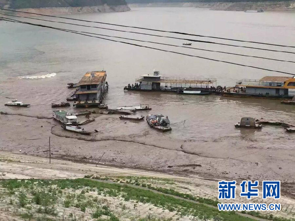 6月24日,重庆巫山县长江边一小码头因对面山体垮塌产生的巨波将船只冲散(手机拍摄)。新华社发(朱云平 摄)