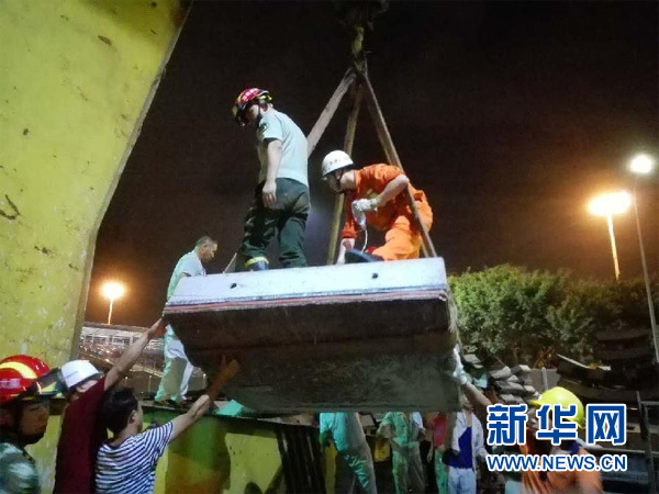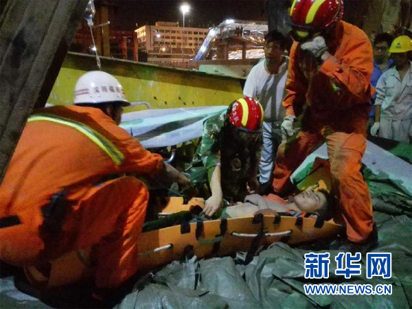 6月26日,深圳消防官兵准备将被困工人运出坍塌现场。 25日16点10分,在建的深圳地铁7号线发生坍塌事故,形成一个直径约10米,深约3米的坑洞。据了解,事故发生在深圳市福田区皇岗口岸南桥国际小区对面地铁施工现场。深圳消防接警后,调两个消防中队出动救援。现场有5人被困,消防员动用扩张和切割设备在狭小空间破拆,目前所有被困人员已全部救出,其中4人受伤,1人经抢救无效死亡。新华社发