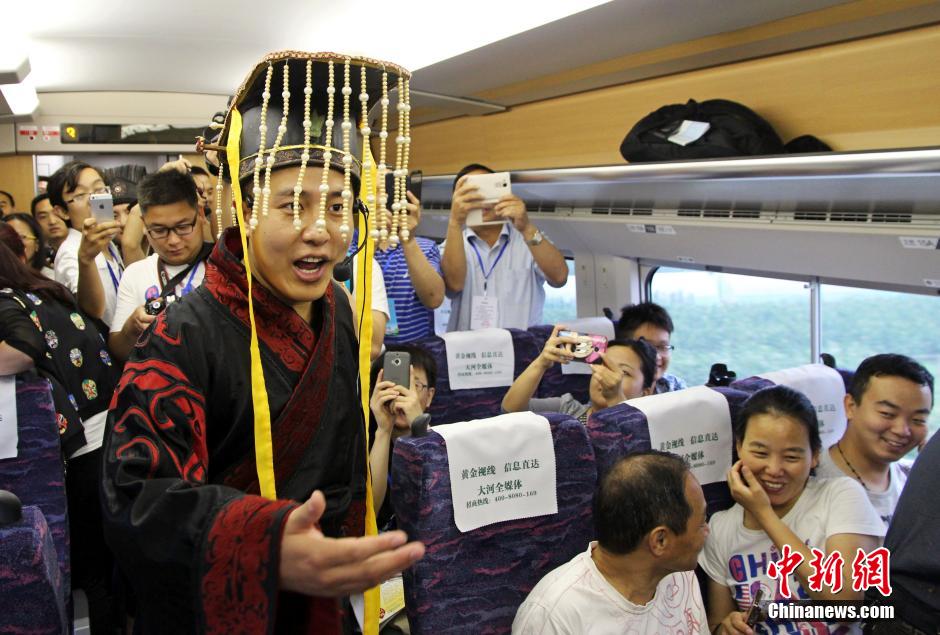 6月26日上午7时15分,郑州站至焦作站的C2900次动车组列车驶出郑州站,标志着郑(州)焦(作)铁路正式开通运营。首趟列车运行途中,焦作市一家古装影视城的演员们身穿古装扮成“秦王”、“大臣”出现在动车上,为乘客即兴表演节目、互动合影,连连赞叹郑焦铁路的舒适快捷。郑焦城际铁路于2010年开工建设,2014年由中铁电气化局三公司启动电气化建设,2015年3月开始联调联试。郑焦铁路动车组线路全长78公里,设郑州、南阳寨、黄河景区、武陟、修武西、焦作6个车站。设计时速为250公里,运行时间由原来的2个多小时缩短至平均40分钟,速度最快时仅需34分钟,这与郑州至焦作的城际大巴和普通火车相比既安全又快捷。动车组运行初期每天开行D字头动车组列车5对10趟,待7月1日运行图调整后,将每日开行9对18趟动车组列车。中新社发 王子瑞 摄 图片来源:CNSPHOTO