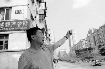 崔怀彬指着被开发后的小区,其背后的3栋居民楼尚未拆除。京华时报记者 常鑫 摄