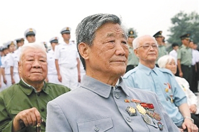 去年7月7日,抗日战争纪念馆,老战士代表参加集会活动。