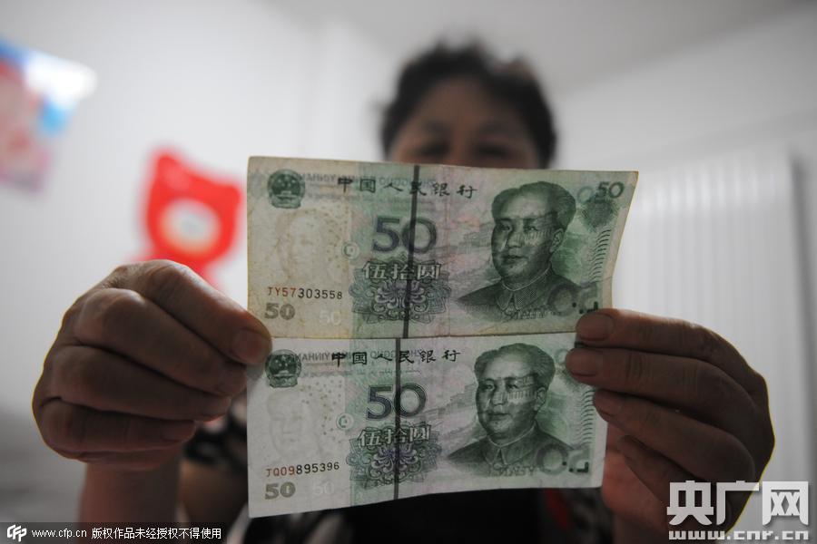董大妈手中持有一枚50元错版人民币,头像睁一只眼闭一只眼。据董大妈称,孩子给钱去买菜,菜贩找了一枚50元面值的人民币给她,由于当心是假币,回家用荧光灯照了照,发现毛主席水印睁一只眼闭一只眼,害怕是假钱,专门到附近的招商银行进行了鉴定钱币为真钞。