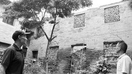 刘振汉(左)和贾保国向记者介绍贾家大院的情况,被焚烧的痕迹依然清晰可见