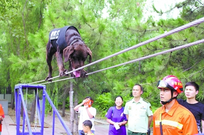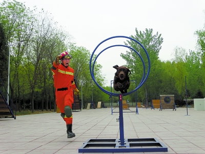 “坐、走、跳……”身着迷彩服的驯导员李刚边跑边发出口令,身旁的搜救犬牛牛跃起翻过竖梯,快速经过独木桥。