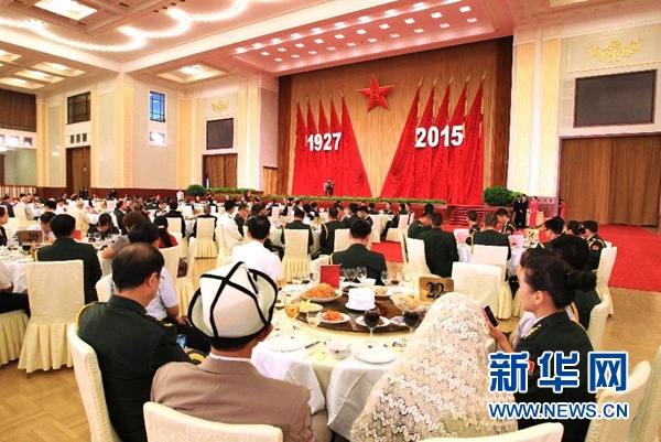 人民大会堂灯火辉煌,充满节日气氛。主席台帷幕中央悬挂着巨型“八一”军徽,两旁是十面鲜艳的红旗。“1927-2015”几个醒目的大字,昭示着中国人民解放军走过了88周年的光辉历程。