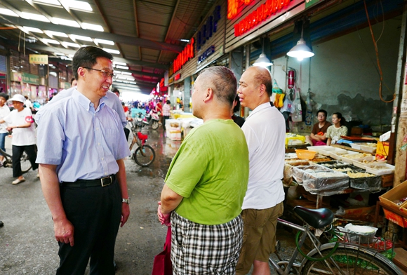 韩正微笑着走上前问两位老人,是否经常来这里买东西,平时这里卫生情况如何。两位老伯你一言我一语说开了:“买东西蛮方便,就是环境太差了,地上脏,早晨四五点钟时还要乱。”听到书记问他们有什么要求,两人异口同声说:“希望把这里的环境抓抓好!”