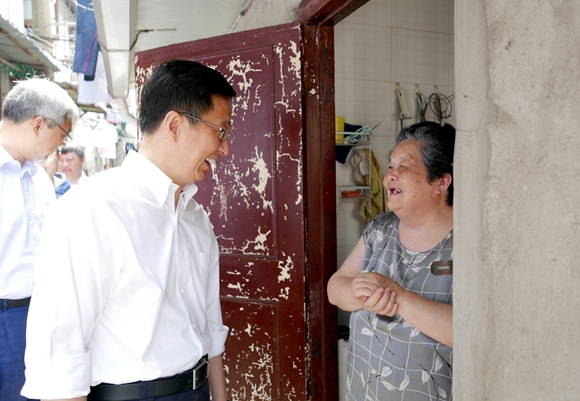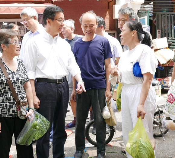 图片说明:韩正与黄浦区豫园街道光启居委的居民交谈。(摄影:陈正宝)