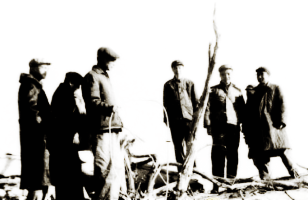1967年,王淦昌(左1)、彭桓武(左2)、郭永怀(左3)和邓稼先(右2)等在我国新疆核试验场区(网络图)