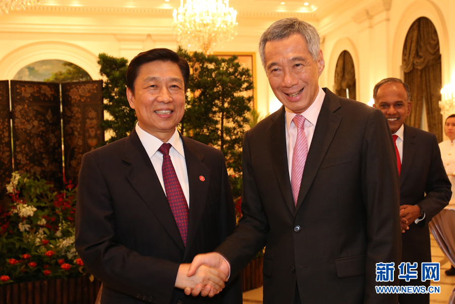 8月9日,新加坡总理李显龙(右)在新加坡总统府与中国国家副主席李源潮握手。 8月9日,国家主席习近平特使、国家副主席李源潮出席了新加坡建国50周年庆典活动,并同新加坡总统陈庆炎简短交谈、分别会见新加坡总理李显龙、副总理兼财政部长尚达曼。新华社发(新加坡外交部提供)