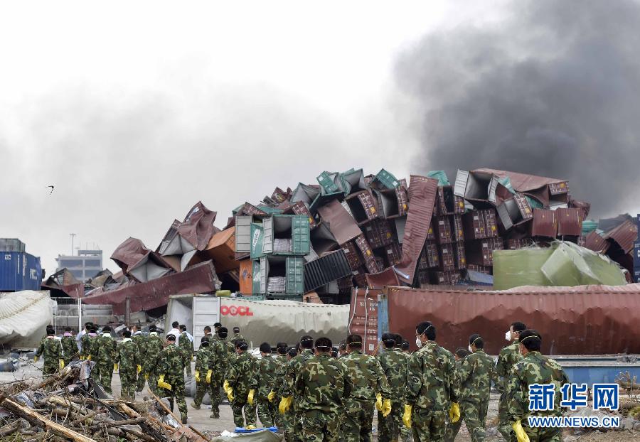 8月14日,抢险救援人员进入爆炸核心区清理现场。当日18时,记者从“8·12”瑞海公司危险品仓库特别重大火灾爆炸事故第三次新闻发布会上了解到,目前事故现场明火基本扑灭。截至14日15时,此次爆炸事故共造成56人死亡,其中消防人员21人;住院治疗721人,其中危重症25人,重症33人。 新华社记者岳月伟 摄