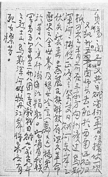 “我五军关师长书范于西南远征归抵刁翎,半月前拟在三家方向拟渡过乌斯浑河,拂晓正渡之际,受日贼河东岸之伏兵袭击。高丽民族解放有深久革命历史之金世峰及妇女冷云(郑XX)、杨秀珍等八人,悉行溺江捐躯……乌斯浑河畔牡丹江岸将来应有烈女标芳。”