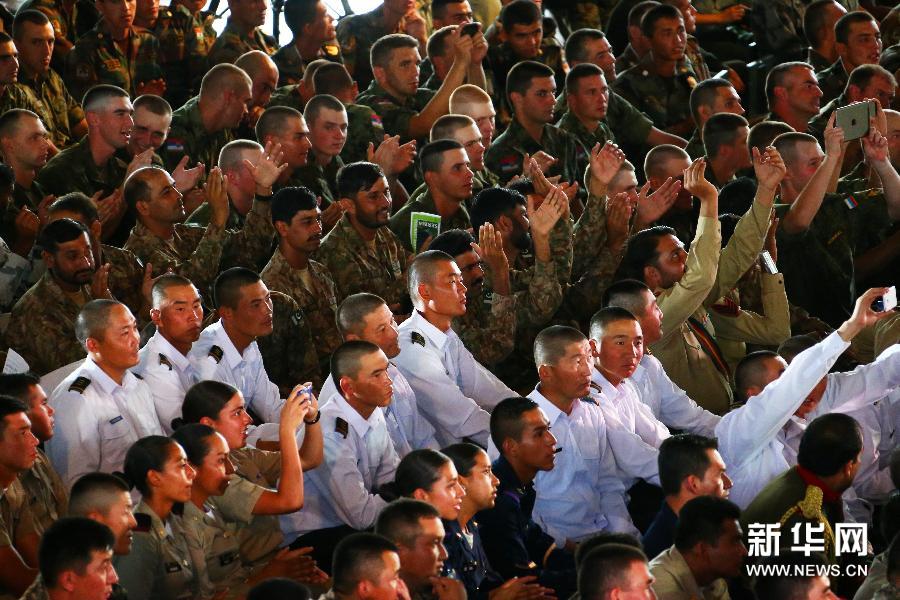 8月25日下午,外军官兵代表在观看文艺演出。当日,来华参加纪念中国人民抗日战争暨世界反法西斯战争胜利70周年阅兵的外军方队和代表队官兵,在阅兵训练基地与中国官兵举行交流联谊活动。新华社记者 查春明 摄