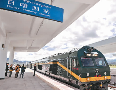 2014年8月16日,拉日铁路通车后,第一列从拉萨出发的火车驶入日喀则火车站。 新华社记者 刘坤 摄