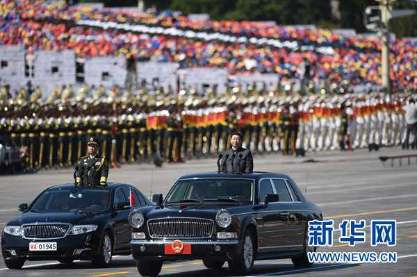 新华网纪念大会现场报道:高亢嘹亮的检阅号角响起,中共中央总书记、国家主席、中央军委主席习近平,乘红旗牌检阅车,开始检阅受阅部队。