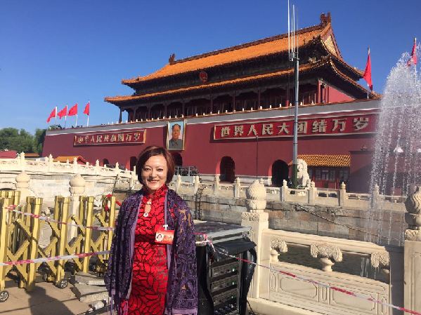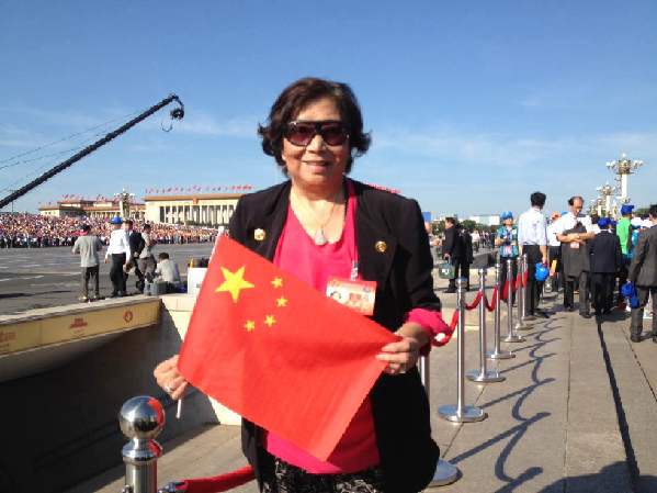 观礼台上,美国国际文化艺术交流学会会长周媄媄身穿大红旗袍,配上红包和红皮鞋,在人群中格外醒目。三个多月前,这位歌唱家在美国洛杉矶举办抗战胜利70周年主题音乐会,为祖国放声歌唱。