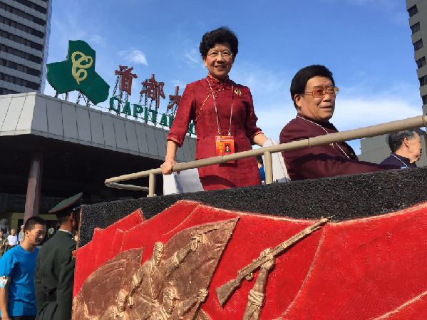 除了观礼的侨界嘉宾,还有65位英烈子女代表乘车参阅,著名作家郁达夫的女儿郁美兰就是其中之一。3日上午,郁美兰身穿大红旗袍,乘坐第一方队的敞篷车,和抗战老兵、抗战支前模范一起,浩浩荡荡经过天安门前。