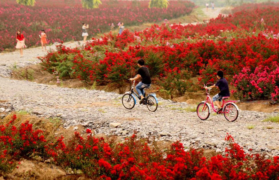 9月4日,初秋时节,四川省华蓥市禄市镇凉水井村正火红盛开的2000多亩紫薇灼灼其华,把乡村妆点得格外美丽迷人,吸引不少市民赏花休闲。
