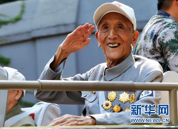 这是抗战老兵乘车方队的一位老兵在敬礼。 新华社记者 朱祥 摄