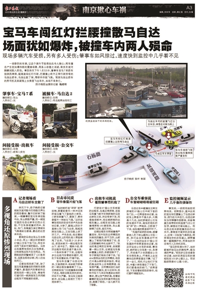 6月20日13时53分,南京市秦淮区石杨路友谊河路口发生一起交通事故。“宝马”轿车高速闯红灯通过路口,拦腰撞断一辆“马自达”牌轿车,后又撞上一辆正常行驶的公交车和一辆出租车。事故造成“马自达”轿车上司机及乘客死亡,被撞出租车驾驶人受伤。