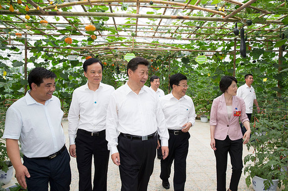 图为:2015年6月16日下午,习近平在遵义县枫香镇花茂村视察现代高效农业智能温控大棚。