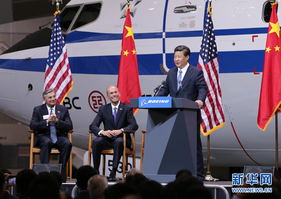 9月23日,国家主席习近平在西雅图参观波音公司商用飞机制造厂。这是习近平在波音公司举行的欢迎仪式上致辞。 新华社记者刘卫兵摄
