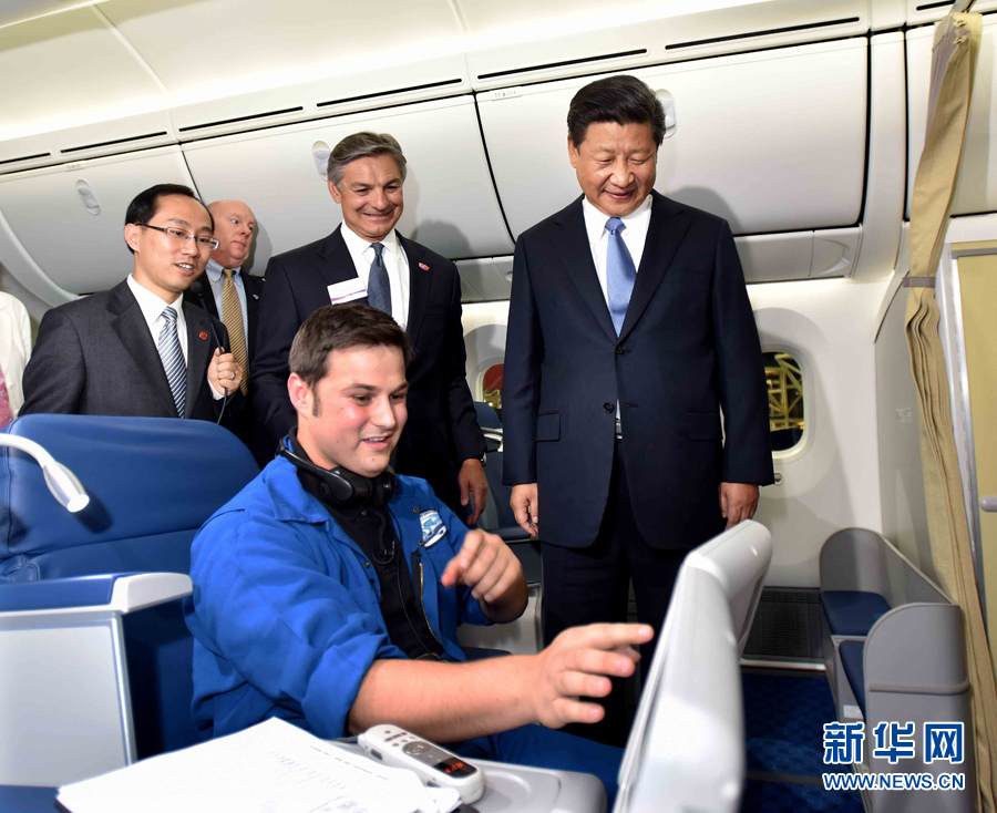 9月23日,国家主席习近平在西雅图参观波音公司商用飞机制造厂。这是习近平登上一架即将交付中国厦门航空公司的波音-787飞机,同员工亲切交流。新华社记者李涛摄