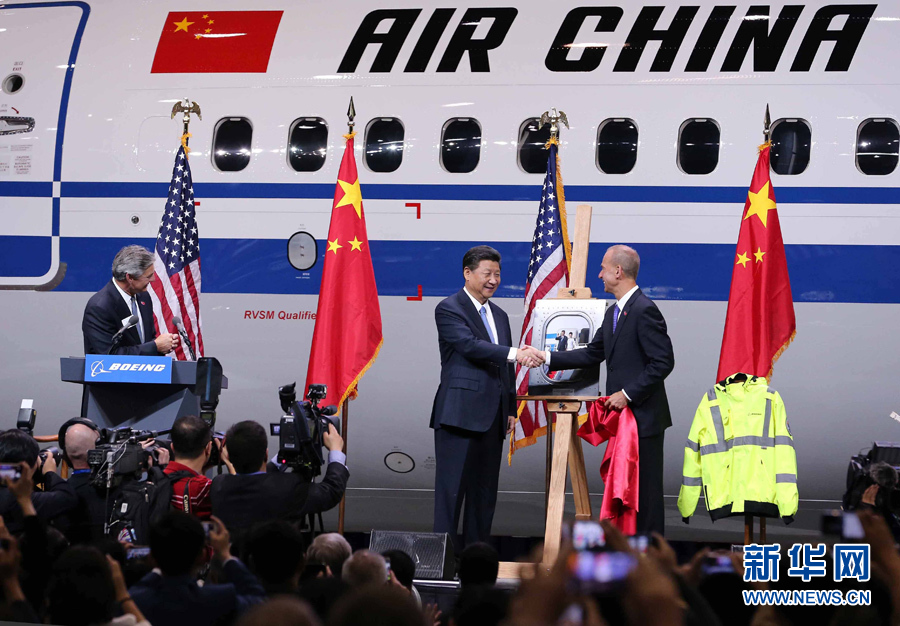 9月23日,国家主席习近平在西雅图参观波音公司商用飞机制造厂。这是习近平出席波音公司举办的欢迎仪式。 新华社记者刘卫兵摄