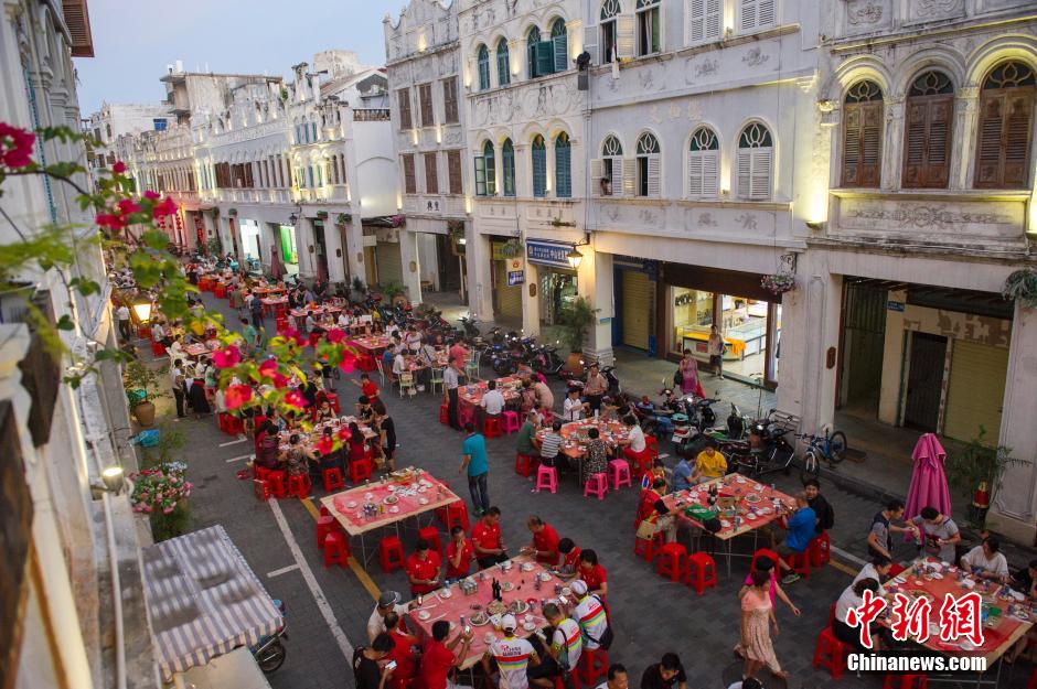 9月24日,中秋临近,海口骑楼老街这个节前格外热闹,街坊摆出了百桌“长街宴”,广邀宾客欢喜迎佳节。据了解,此次“长街宴”摆席上百桌,参加者超过700人,宴席菜品极具海南风格:海南粉、文昌鸡、糯米糕、椰子汁等。 中新社记者 骆云飞 摄