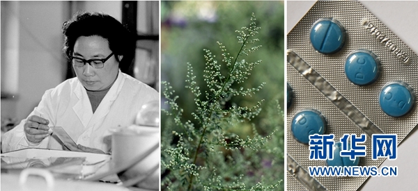 屠呦呦、青蒿和抗疟疾成药(拼版资料照片)。新华社发