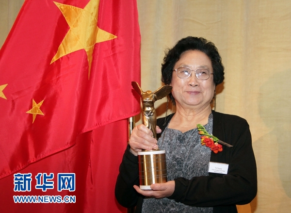 中国中医科学院终身研究员屠呦呦在美国纽约举行的拉斯克奖颁奖仪式上领奖(2011年9月23日摄)。新华社记者王成云摄
