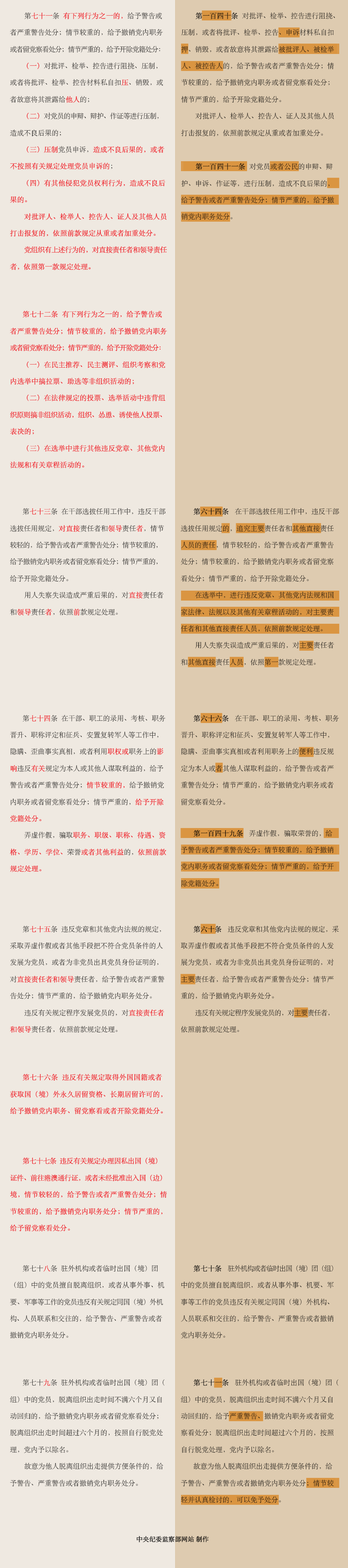 《条例》第69条—71条明确了“侵犯党员权利”等违反组织纪律的行为,比如“诬告陷害他人意在使他人受纪律追究,侵犯党员的表决权、选举权和被选举权”等,并对处分情形作了明确规定。