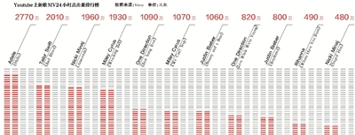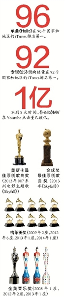 “Hello, it's me”英国天后Adele以一首新歌《Hello》宣告回归乐坛,并宣布第三张录音室专辑《25》将于11月20日发行,距离上张专辑《21》已经四年多了。上周五,这张新专辑中的第一首歌《Hello》率先上线,新歌MV由当红的加拿大导演哈维尔·多兰拍摄。MV在Youtube一上线就打破了纪录——成为上线24小时内点击量最多的MV,而不到5天的时间,点击量已经破亿。新歌《Hello》和新专辑《25》(预购销量)同时登上了90多个国家和地区的iTunes排行榜第一名。人称“格莱美收割机”的Adele以“屠榜”的方式强势回归了!资料整理:Dionysus