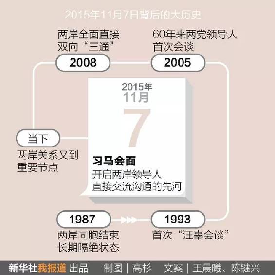 2015年11月7日,两岸领导人习近平、马英九将在新加坡会面,就推进两岸关系和平发展交换意见。这是两岸关系发展史上具有里程碑意义的大事。(来源:新华社客户端 文字:陈键兴、王晨曦)