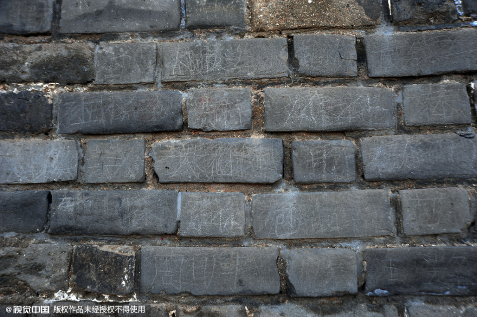 2015年11月9日,河北秦皇岛,山海关区的“老龙头”是万里长城的起点,距“老龙头”仅百米的铁门关城墙上,各路游客在长城砖上的“签名”。