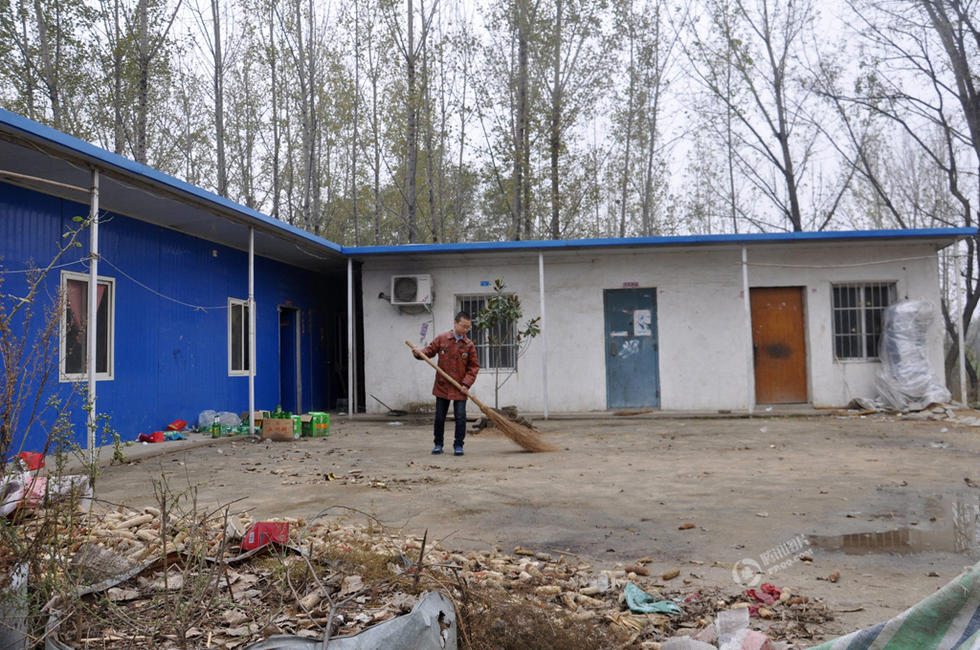 汪洋的家位于村子的东南角,没有围墙,两排简易房呈“L”型,西边的简易房是几个姑姑兑钱搭建的,奶奶去世前就住在中间那个房间里。汪洋和父亲就住在东边的简易房里,屋里有一张双人床,汪洋每天都要搂着父亲才能入睡。图为汪洋在院子里打扫卫生。