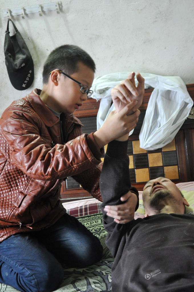 2012年底,汪建党病情恶化瘫痪在床,汪洋和奶奶每天照顾父亲生活。由于奶奶已经是80多高龄,拖不动生病的汪建党,无奈,2013年底汪洋决定放弃学业,在家照顾父亲。每天,汪洋都要坚持给父亲按摩四五次,一个过程下来,经常累得浑身大汗。由于父亲经常便秘,拉不出大便,汪洋只好用手抠帮助父亲解大便。父亲脾气暴躁,加上病痛的折磨,经常会无端发脾气,让人很难忍受,但汪洋也从不顶撞,还主动伸出胳膊让父亲撕咬,一年下来,汪洋两个胳膊上满是父亲的牙印儿。图为汪洋为父亲活动手脚。