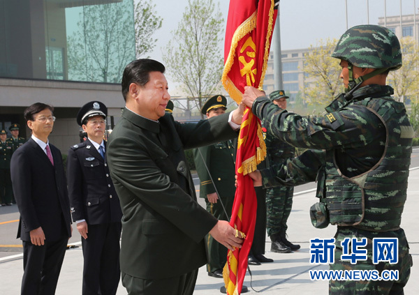 2014年4月9日,习近平视察中国人民武装警察部队特种警察学院并为“猎鹰突击队”授旗。这是习近平将队旗郑重授予“猎鹰突击队”大队长。新华社记者 李刚 摄