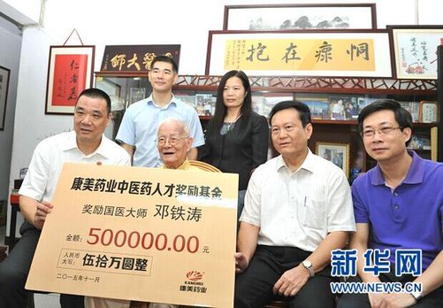 广州中医药大学党委书记黄斌,广州中医药大学第一附属医院院长冼绍祥,康美药业董事长、总经理马兴田,副董事长、常务副总经理许冬瑾,副总经理李建华等领导专程到“国医大师”邓铁涛教授家中登门拜访,并颁发50万元个人奖励基金。