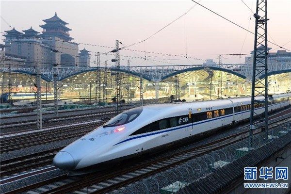 资料图片。2012年12月26日清晨,一列京广高铁列车进入北京西站。当日,京广高铁全线开通运营。京广高铁北起北京,南至广州,全长2298公里,是目前世界上运营里程最长的高速铁路。京广高铁全线设计速度350公里/小时,初期运营速度300公里/小时,从北京至广州最快运行时间将在8小时左右。新华社记者 周国强摄