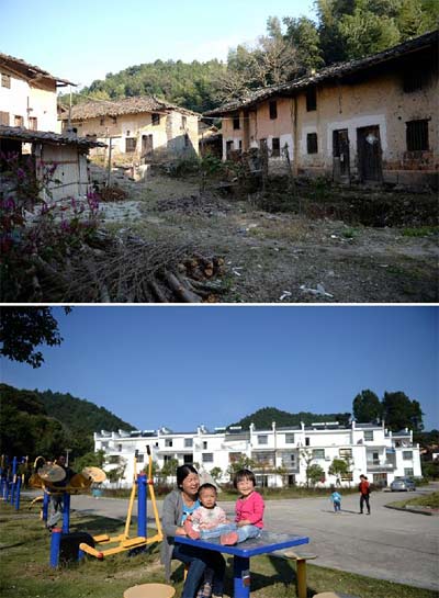 上图:江西省广昌县驿前镇贯桥村旧址一角;下图:村民们在贯桥村统一安置点的健身娱乐区域活动(拼版照片,10月14日摄)。 新华社记者 陈子夏 摄