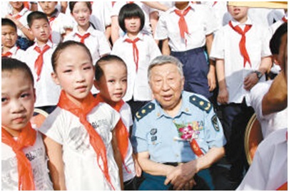 图为阎肃接受少先队员采访。图片来源网络