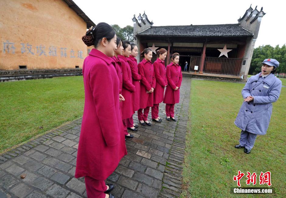12月10日,动车组乘务员在中华苏维埃第一次全国代表大会会址体验当时开会时的场景。当日,将执行连接闽西、赣南两大革命根据地,有着“红色高铁”——赣瑞龙铁路客运任务的南昌铁路局福州客运段动车组乘务员来到江西瑞金了解红色文化。日前,赣瑞龙铁路进入试运行阶段,本月底将具备通车条件。瑞金是闻名中外的红色故都、共和国摇篮、苏区时期党中央驻地、中华苏维埃共和国临时中央政府诞生地,将结束赣南原中央苏区无动车组通行的历史。张斌 摄
